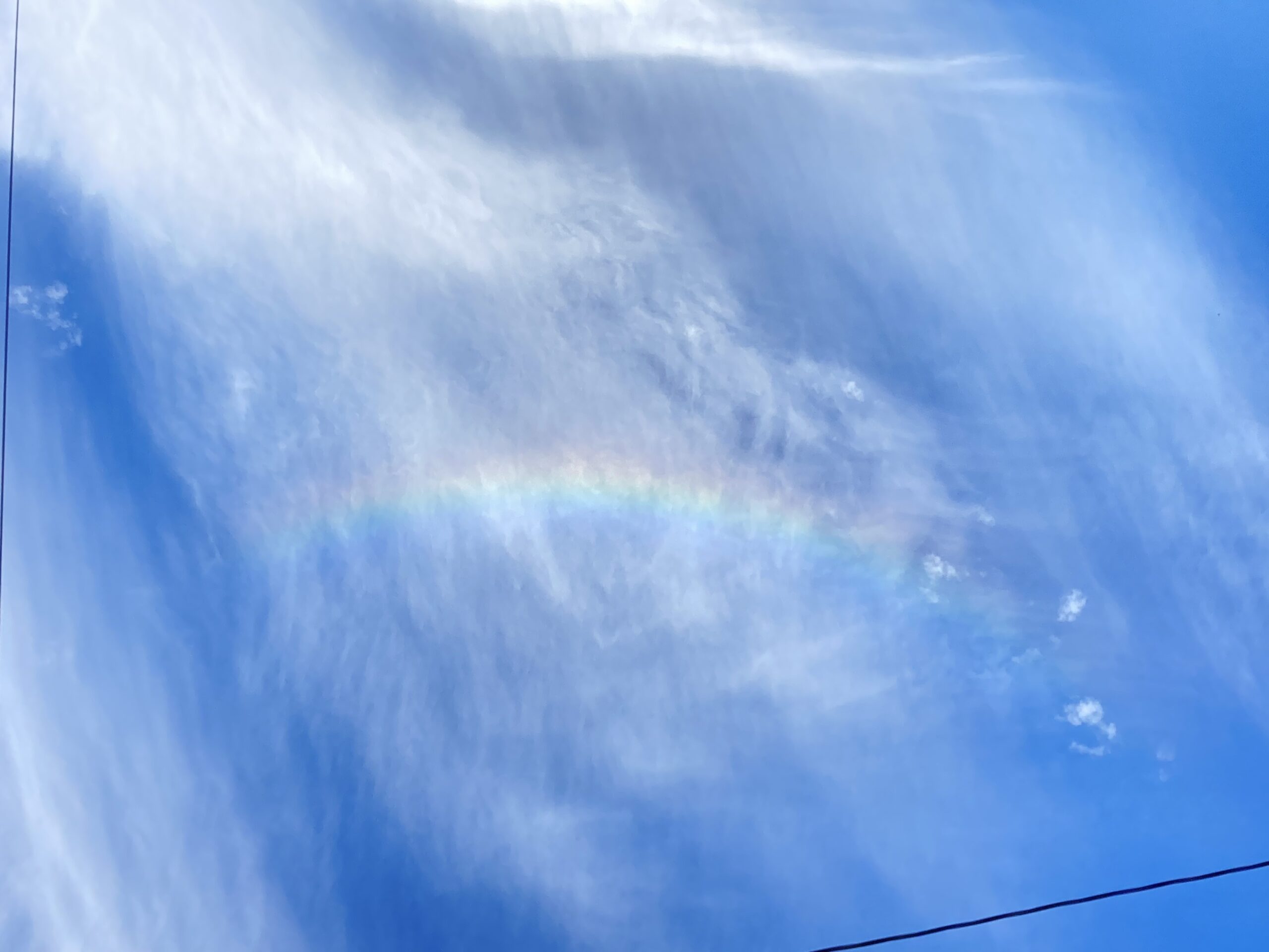 今日の午後、用事があって次女と外を歩いていました。突然真上を見上げて「虹があるよ!」と言い出した次女。こんな青空なのに???と思って適当にそうだね〜と話を合わせていると、何度も虹だよ!と言ってきます。まさかなぁと思いながら青空を見上げてみると、本当に虹のようなものが雲の中に見えるではありませんか!次女の言うことを素直に信じなかった自分の頭の硬さに反省しつつ、次女は何で突然あんな真上を見ようと思ったんだろう?と考え、でも次女のおかげで綺麗な虹らしきものをを見れて幸せでした。